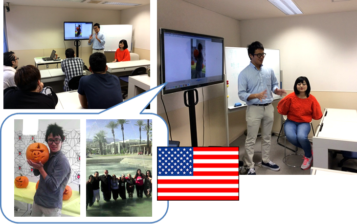 海外留学ガイダンス授業内で、自身のアメリカ留学について話してくれました。時津くんは現在アメリカ・カルフォルニアにあるCollege of the Desert(2年制大学)で心理学を専攻しています。勉強は大変ですが、良いホームステイファミリーに出会い、休暇はロサンゼルスやハリウッドに旅行にも行きました!今は夏休みのため、日本に一時帰国中。