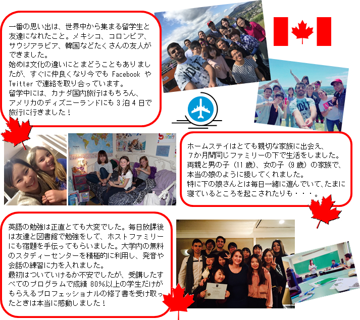 神部さんは卒業後に7か月間ビクトリア大学附属語学学校(カナダ)に留学し、先日帰国しました。