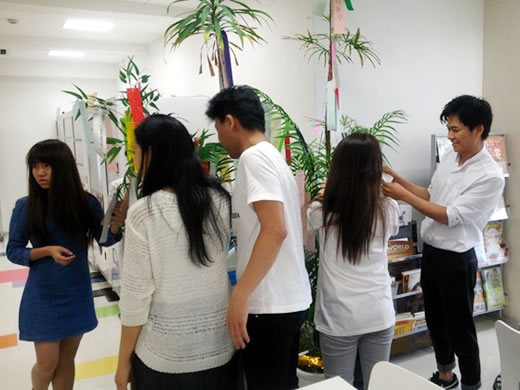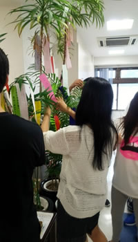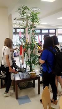スンダイでは、国際交流行事の一環として、日本人学生と世界の国から学びに来ている留学生と一緒に七夕の笹に願い事を書いて短冊に飾ります。