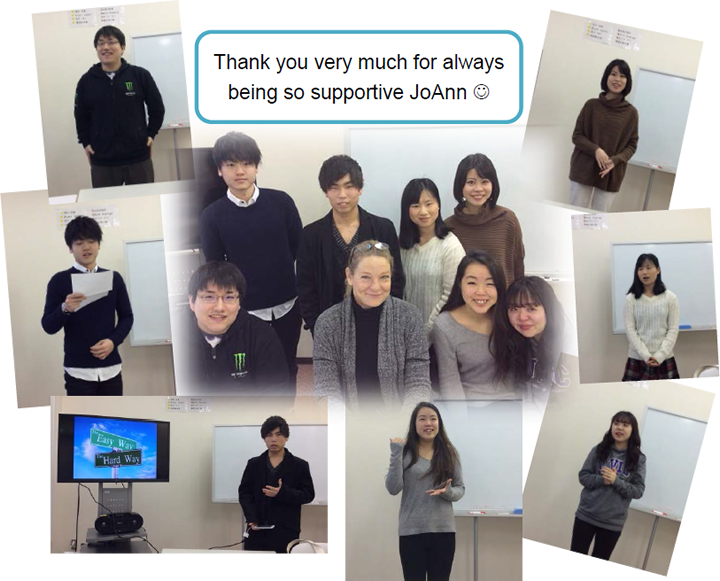 英語4技能『読む・書く・聞く・話す』のうち、多くの学生が苦手とする英語スピーチ。英語力はもちろん、ジェスチャー、アイコンタクト、スライドVA機材の使用など、英語以外のさまざまなスキルが必要とされます。学生にとっては苦労の連続でしたが、卒業式を目前に、先生・クラスメイトへの感謝の気持ちを堂々と発表する姿に、時には温かく、時には厳しい指導を続けてきたジョアン先生も涙。