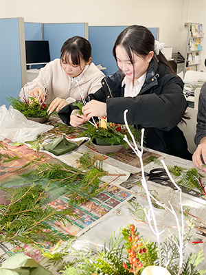 エアライン学科1年生が、授業の一環としてフラワーコーディネートを学び、クリスマスをテーマにしたフラワーアレンジメント作品を制作しました。