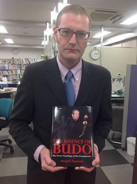 本校英語講師マシュー・コットリル(Matthew Cotterill) 先生が編集・翻訳を手掛けた本「The Essence of BUDO ~The Secret Teachings of the Grandmaster」が講談社New Yorkより出版されました。数年にもかかったプロジェクトが無事終了し、マシュー先生は満足気。