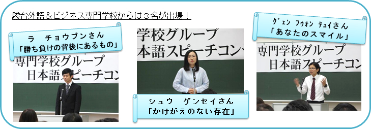 12月15日に、駿台専門学校グループ「日本語スピーチコンテスト」を実施しました。駿台専門学校グループ(東京4校、大阪1校)には、多くの留学生が在籍しています。