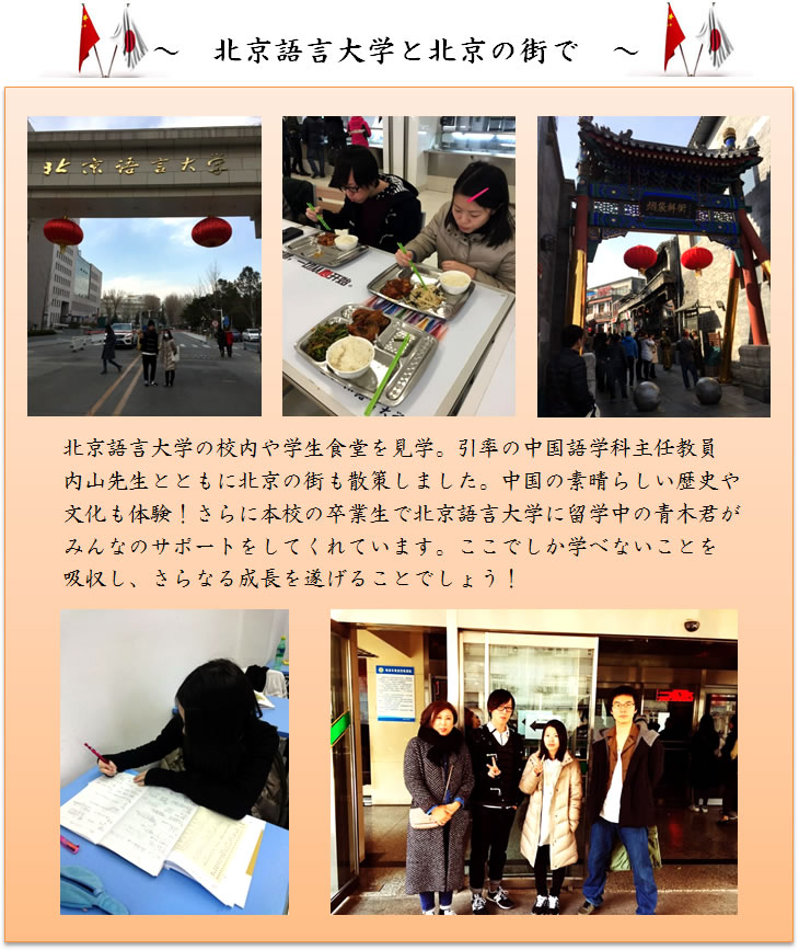 ホーム 新着一覧 新着情報 2016年3月4日 中国語学研修レポート 中国語学科1年生が2月24日より約1か月間の語学研修へ― 今年も研修先は中国語教育に定評のある北京語言大学です。 今まで学んできた中国語を実践し、更なる飛躍を目指して猛勉強中です! 本校の特長 教育システム 講師一覧 講師メッセージ 在校生メッセージ 学校行事 Q&A MESSAGE 卒業後の進路 卒業後の進路 就職 大学編入 海外留学 資格取得 入学要項 学生募集要項 コース案内 コース一覧 エアライン学科2年制 エアラインコース 空港サービスコース 英語学科2年制 英語ビジネスコース 大学編入コース 留学コース 二言語キャリア学科2年制 韓国語+英語コース 韓国語学科2年制 韓国語コース 中国語学科2年制 中国語コース 語学専科1年制 英語ビジネスコース 英語海外留学コース 韓国語コース 中国語コース オープンキャンパス オープンキャンパス 日程一覧 資料請求・イベント申込 資料請求・イベント申込