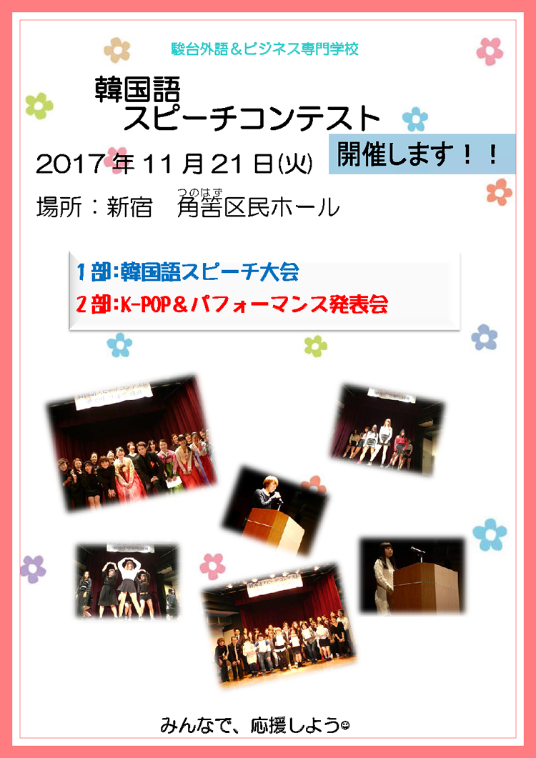 ホーム 新着一覧 新着情報 2017年10月13日 韓国語スピーチコンテスト開催します < 本校の特長 教育システム 講師一覧 講師メッセージ 在校生メッセージ 学校行事 Q&A MESSAGE 卒業後の進路 卒業後の進路 就職 大学編入 海外留学 資格取得 入学要項 学生募集要項 コース案内 コース一覧 エアライン学科2年制 エアラインコース 空港サービスコース 英語学科2年制 英語ビジネスコース 大学編入コース 留学コース 二言語キャリア学科2年制 韓国語+英語コース 韓国語学科2年制 韓国語コース 中国語学科2年制 中国語コース 語学専科1年制 英語ビジネスコース 英語海外留学コース 韓国語コース 中国語コース オープンキャンパス オープンキャンパス 日程一覧 資料請求・イベント申込 資料請求・イベント申込