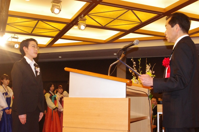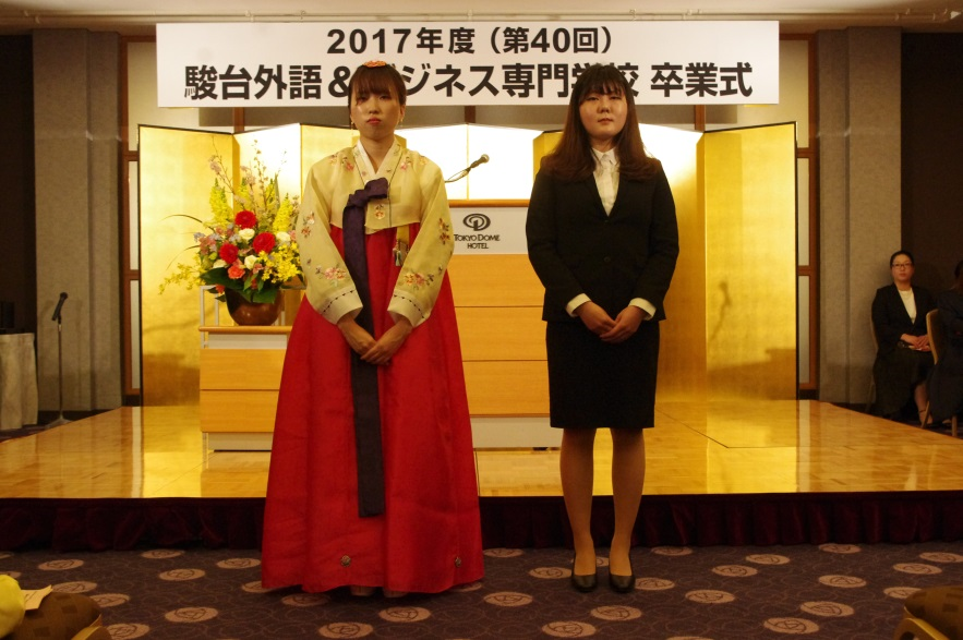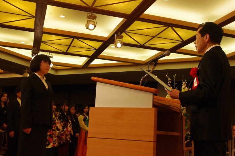 卒業証書授与の卒業生代表は、英語学科・英会話コース 山田 美里さん、 国際語学学科・国際貿易コース チョウ・エイさんです。