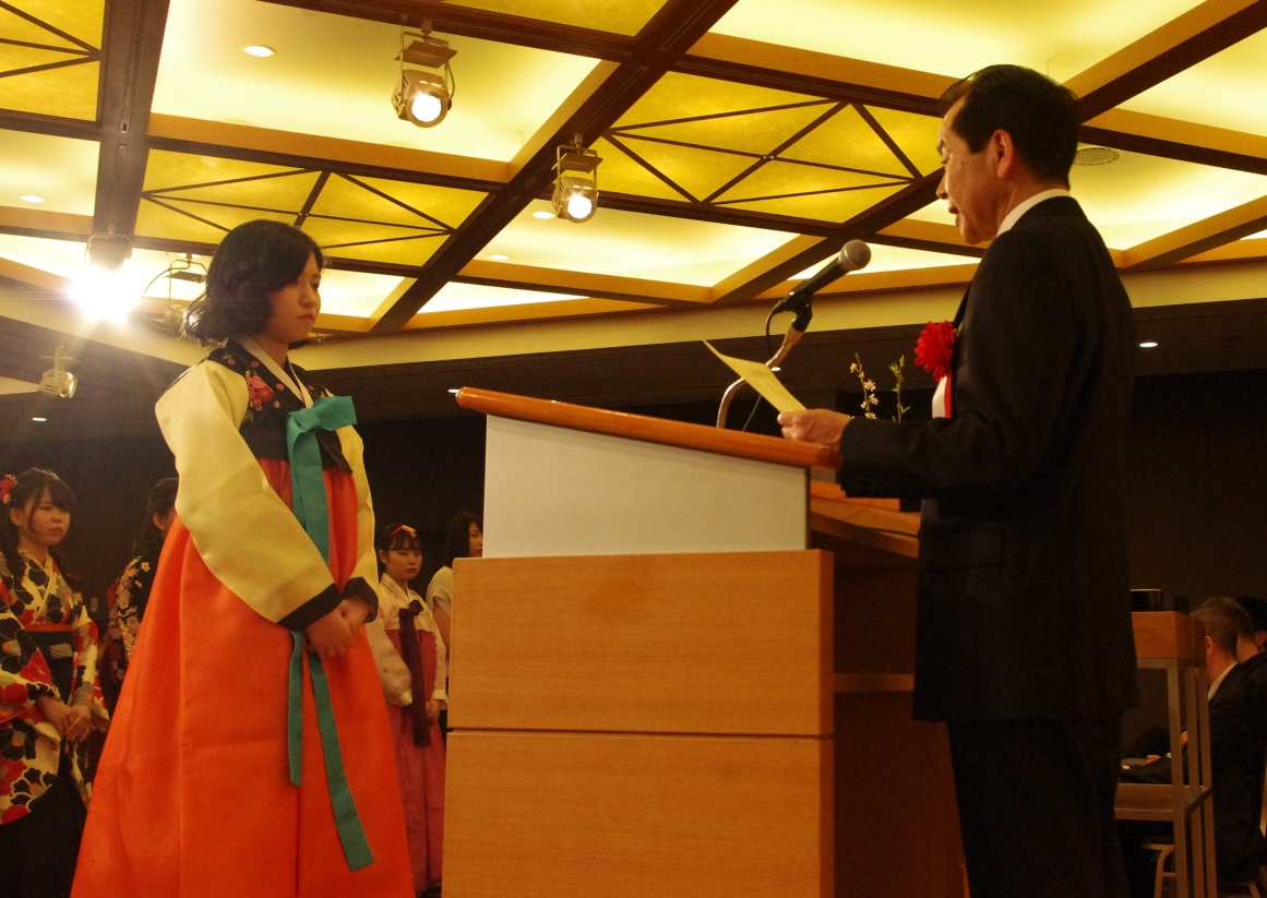 全学科の中で最も優秀な人物・学業を修めた方に贈られる「理事長賞」に輝いたのは、韓国語学科の野村 美香さん(左)と国際語学学科 ソン シヨンさん(右)です。
