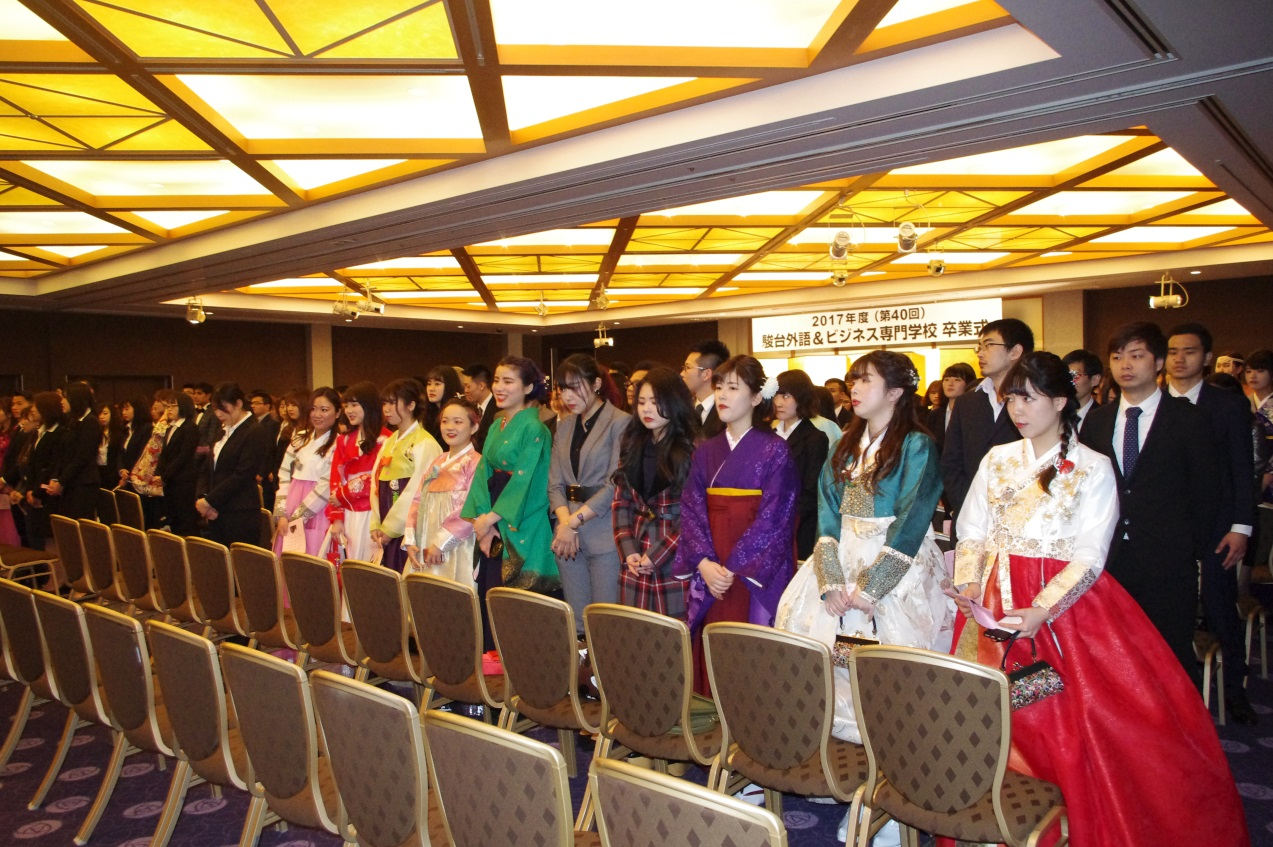 3月9日(金)、本校の第40回卒業式が東京ドームホテルにて執り行われました。卒業生にとっての晴れの舞台、袴や各国の民族衣装を身にまとい卒業式典に参列しました。