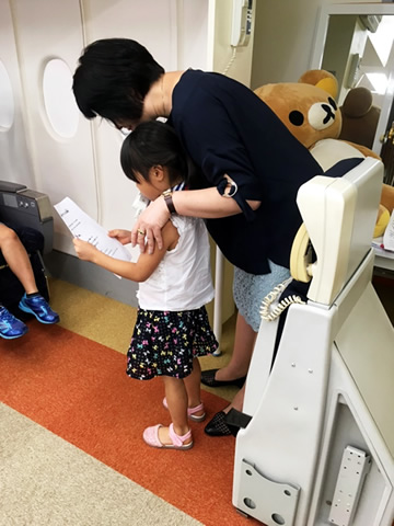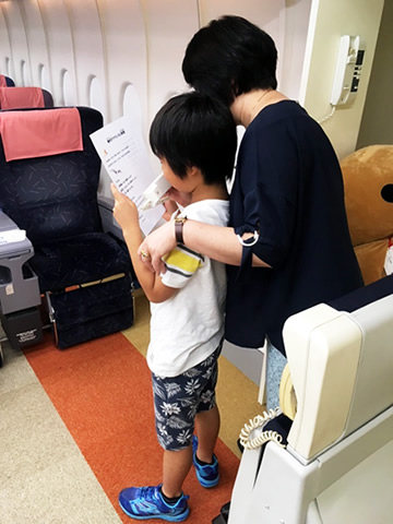 飛行機のモックアップに移動して、まずは先生と一緒に機内アナウンスの練習をします。何度か練習したら、アナウンスの機械で挑戦!先生がサポートしてくれるから安心です。