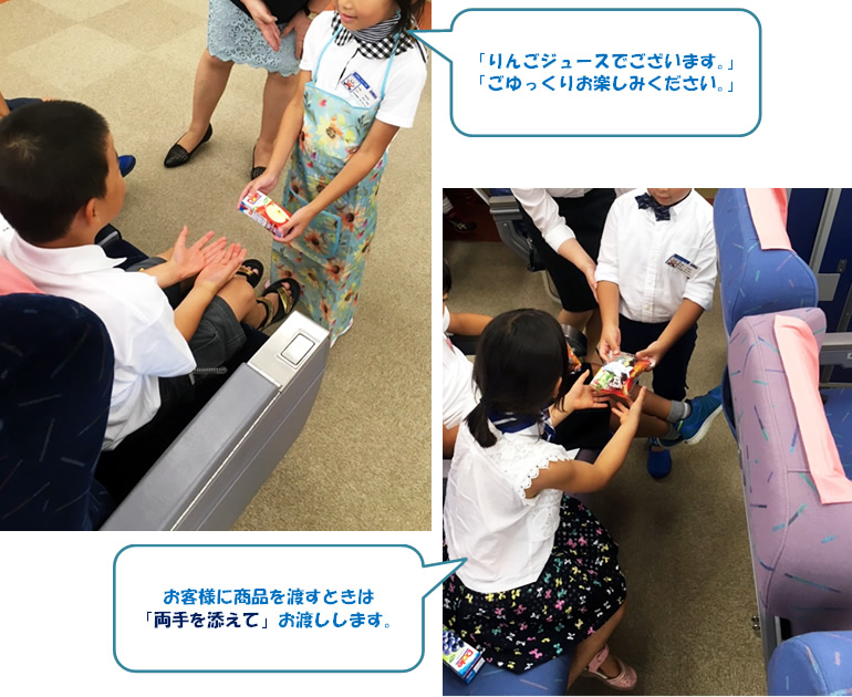 機内サービスの提供体験では、飲み物を載せたカートを二人一組で押したり、お客様にお飲み物のサービスをしました。