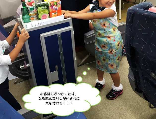 飛行機の通路は狭いので、カートを押すときは、「お足元を失礼いたします。」と声を掛けながら、ゆっくりと移動します。簡単そうに見えますが、実際にやってみると難しいんです。