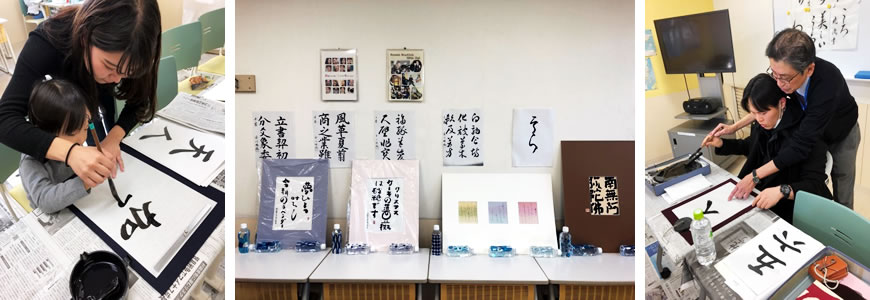 書道の師範である教務課安川先生による書道教室。3歳の男の子も初めての書道に挑戦!たくさんの留学生の参加もあり、大いに賑わいました。また、趣味が書道という在校生が、素晴らしい作品をたくさん展示してくれました。