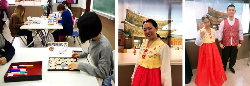 韓国人講師が中心となり、韓国の伝統的な遊び(トゥホ)紹介、韓服体験、キンパ(韓国風海苔巻き)の提供を行いました。大人気の韓国ブースでした。