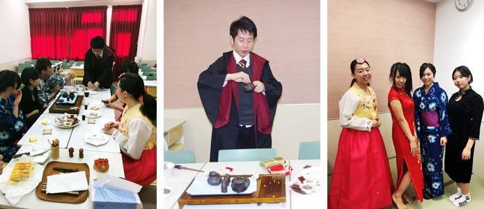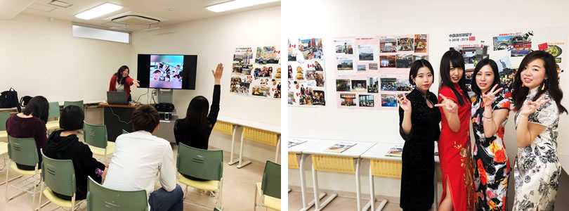 台湾出身の留学生チンさんが、中国と台湾のグルメや行事の紹介を行いました。また、中国茶のデモンストレーションや、台湾で有名な銘菓を味わいながら、学生はチャイナドレスを身にまとい、駿台式チャイナタウンを楽しみました。