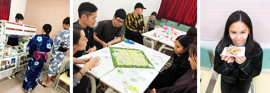大阪出身の就職担当の加賀谷先生が、昨年に引き続き、本場のたこ焼きを提供。文化祭で一番人気の屋台でした!他にも、日本の伝統的な遊びも紹介し、留学生&日本人混合でカルタに挑戦しました!