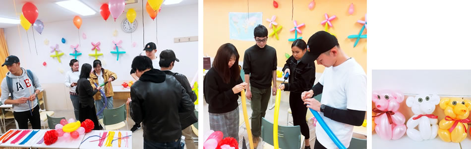 1本の長い風船から、犬やうさぎ、チューリップなど様々な形に生まれ変わるバルーン・アート。英語ビジネス学科の学生が参加者に作り方を指導。たくさんの人が集まり大賑わいでした!
