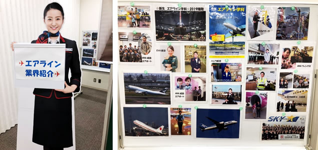 エアライン学科の藤田先生より、エアライン業界の紹介ブース。エアライン学科の現役学生も参加し、業界の魅力を、採用に至るまでの体験談と共にトークライブ形式で紹介しました。
