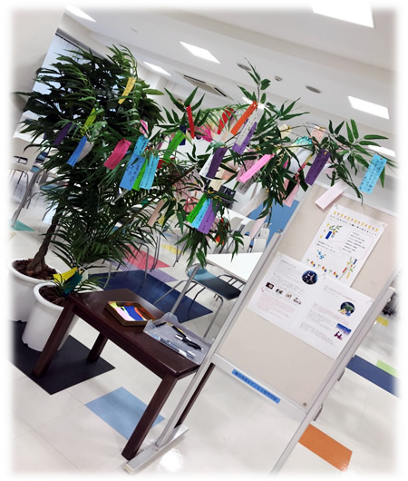 今週の日曜日は「七夕」ということで、先週から学生ホールに七夕用の笹を設置しています。