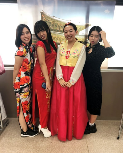 …日本、韓国、中国の民族衣装を身に纏い、京都・韓国・中国のその国らしい街並み風景写真をバックに記念写真!