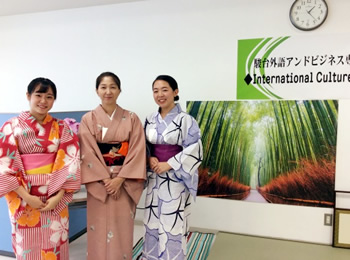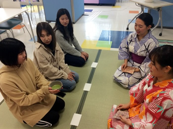 茶道の中村先生と、英語学科の学生が茶道の披露をしました。参加者は茶道に挑戦!初めて茶道を体験したという学生が多く、また、日本人学生にとっては、日本文化の素晴らしさを再発見でき、大変貴重な経験となりました。