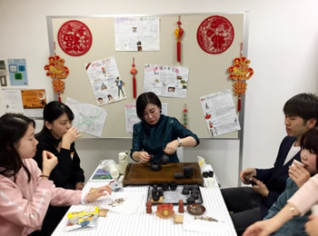 中国語学科主任の内山先生が本場の入れ方で中国茶を提供しました。中国では、お茶と一緒にいただくお菓子はヒマワリの種!中国語学科が作成したポスターを紹介しながら、中国文化を堪能しました。