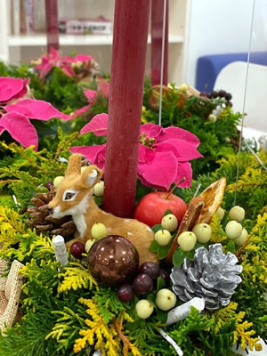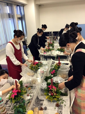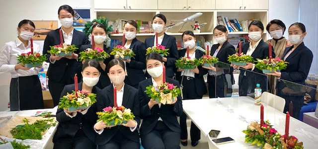 年間を通して、様々なおもてなしの心を学ぶ講座を開催するエアライン学科ですが、毎年恒例のクリスマス用フラワーアレンジメントの講座を今年も開催しました。