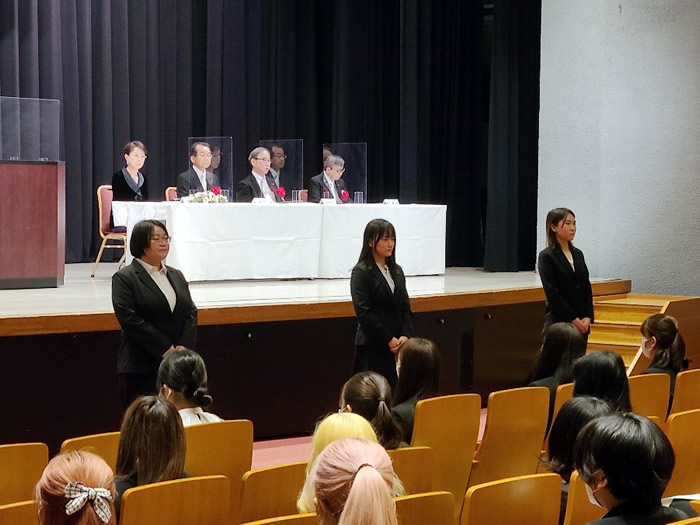 式典では、山﨑良子理事長より新入生に向けてご挨拶をいただき、新しい学校生活を送るうえでの心構えや、勉学だけでなく様々な人々との交わりの大切さについてお話しいただきました。