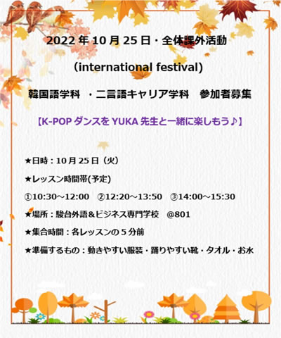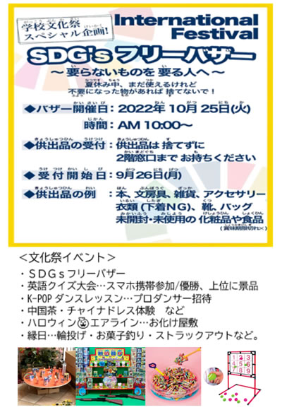 今年もあと残り3ヶ月となりましたが、10月25日(火)には文化祭、11月22日(火)にはスピーチコンテスト、12月2日(金)にはXmasイベント(劇団四季「アナと雪の女王」観劇)も控えています。