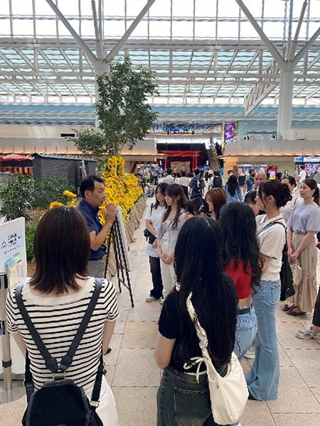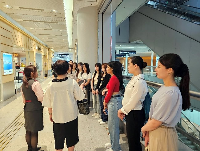 実際に空港内の各所を歩きながら会社や施設などの紹介、本校の卒業生で現役の客室乗務員との会話を通して、空港で働くということにより具体的なイメージが持てたのではないでしょうか。