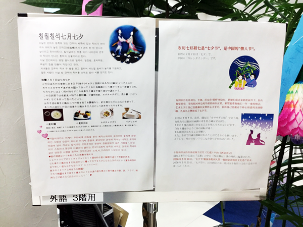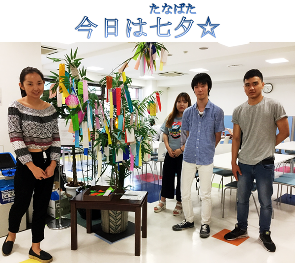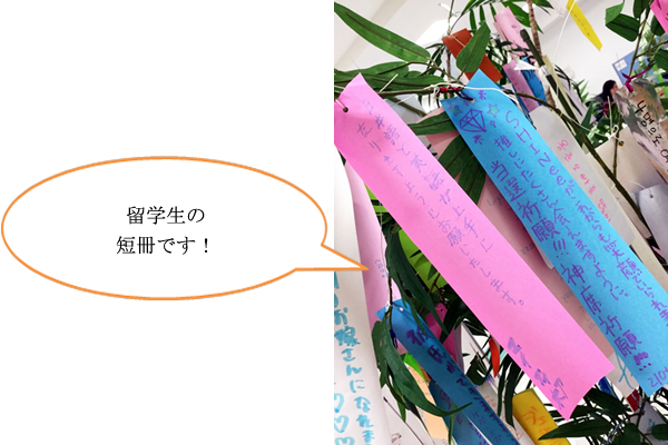 駿台外語&ビジネス専門学校では、学生ホールに笹と短冊を用意し、学生の願い事を飾っています。自分の習っている言語で書くのがルールです。留学生は日本語で書きます。