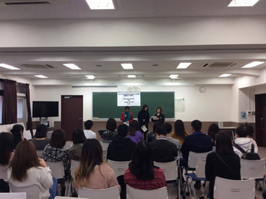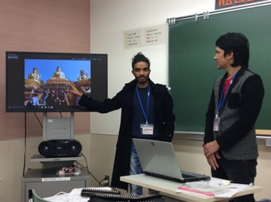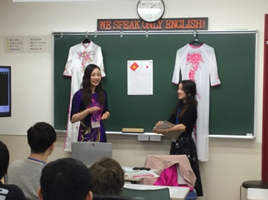 本校に在籍している各国の留学生が母国の文化を紹介してくれました。民族服や名所・食べ物紹介。そして母国語のレッスンも…。