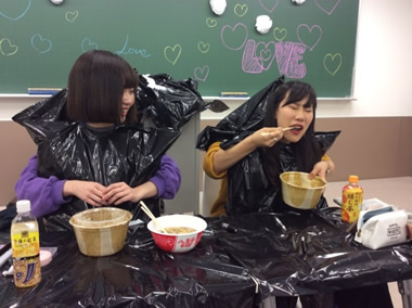 羽織りの中に2人で入り、背後の人が前の人の手の役をする日本の伝統的な芸を披露しましたあっつあつのおでんを食べたり、お化粧♡をしてみたり、大熱演でした!