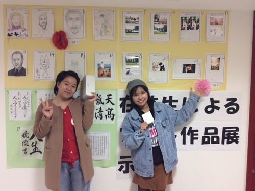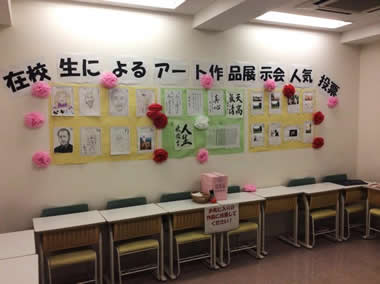 “芸術の秋”という言葉にちなみ、学生から応募された先生の似顔絵・写真・絵画・書道などのアート作品を教室内に展示し、その中からお気に入りの作品を一つ選んで投票してもらいました。