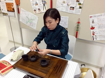 中国語学科の内山先生から本場の中国茶を正式な入れ方で学生の皆さんに味わってもらいました。中国では、お茶と一緒にいただくお菓子はヒマワリの種!中国語学科が作成したポスターを紹介しながら、中国文化を楽しみました。