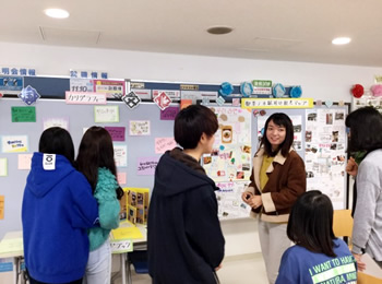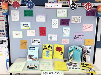 韓国語学科の学生による、韓国文化紹介の展示と解説です。大人気のK-popから、韓国旅行のオススメスポットなどを紹介。韓国人観光客が御茶ノ水へ観光に来ることを想定し、韓国語で御茶ノ水周辺マップも作成し、発表しました。