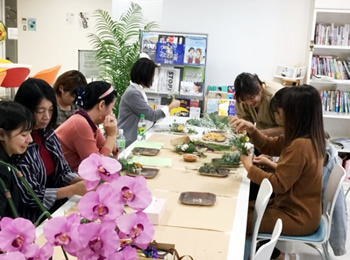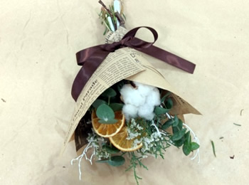 安孫子先生による、ドライフラワーで作るスワッグ教室。スワッグとは、ドイツ語で「壁飾り」を意味し、ヨーロッパでは古くから魔除けや幸運を呼び込む願いを込めて、玄関に飾る伝統があります。