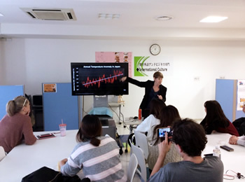 ネイティブのメリーベス・ホリアイ先生が「環境問題」について説明しました。現在、世界が抱えている環境問題を分かりやすく説明していただき、説明の後には質問がたくさん出ました。