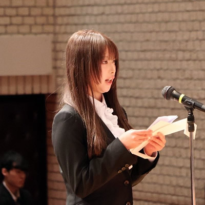 そして、新入生代表「誓いの言葉」では、二言語キャリア学科の若林 瞳さんが、舞台上から「誓いの言葉」を述べました。